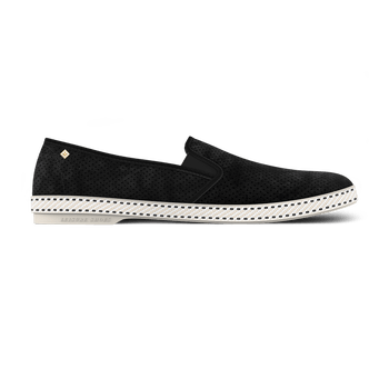 Perforated suede loafer . Perforated suede . Canvas lining . Gold-plated metal rivet . grosgrain ribbon bias . Ease elastics . Removable leather insole . Saddle-stitch cotton band around sole . PVC sole Please Note: Suede styles will stretch a little when worn. We recommend your usual size. These are natural leathers, and the quality and colors may vary between different productions. Made in Spain Composition . Upper: 100% cowhide suede . Lining: 100% cotton canvas . Insole: 30% lambskin 40% carbon latex 30% cork . Outsole: 100% PVC Rivieras is committed to more responsible fashion. As part of our traceability project carried out in partnership with Crystal chain, we reveal the origin and manufacturing details of our garments. To find out more, scan the QR code on the label inside the garment;