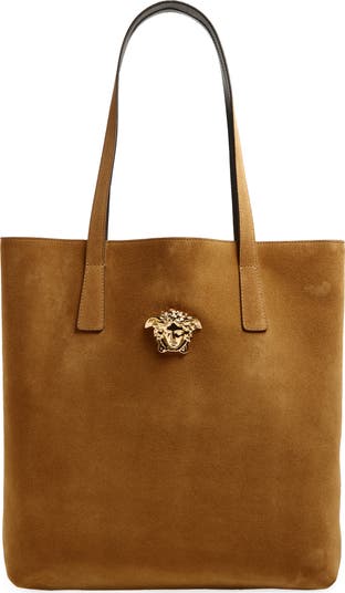 High-polish Medusa-head hardware creates a house-signature focal point on this Italian-crafted tote cut from rich, supple suede.