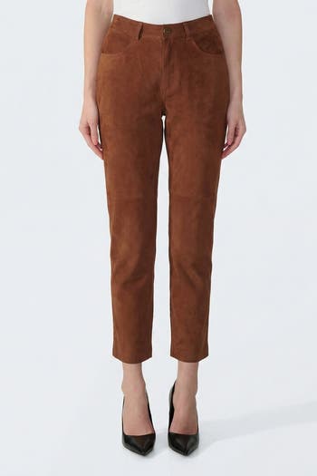 Soft suede with a clean straight leg, mid-rise fit, and full lining for all-day comfort. A cropped length and five-pocket styling keep it modern and polished. Crafted from premium suede with a refined, structured finish, these straight-leg trousers bring elevated texture to everyday tailoring. A mid-rise waistband with belt loops, button-and-zip closure, and classic five-pocket design create a timeless silhouette that wears well from season to season. Fully lined for smooth comfort, the cropped ankle-length hem pairs easily with heels, loafers, or sleek boots. Ideal for smart-casual outfits, these suede pants add depth and sophistication to workwear, dinner plans, and weekend styling.