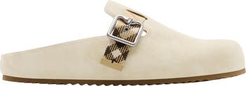 A pair of clogs crafted in Italy from soft suede, set on a grooved sole moulded with archive Burberry lettering. The design is finished with an adjustable B buckle strap, jacquard-woven with the Burberry Check.||Rounded toe|Suede insole|Burberry lettering at sole|Comes with a dust bag