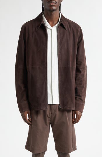 The haute-outerwear label introduces a timeless finishing layer to your capsule wardrobe with this classic zip-front jacket crafted from rich panels of suede.