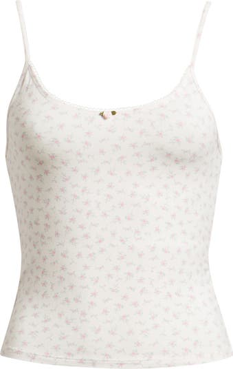 A single rosette blooms along the neckline of this soft jersey camisole featuring a faded floral print.