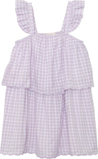 This Sugar Plum gingham dress features a lightweight, textured fabric perfect for warm weather. Designed with ruffled shoulder straps, a gathered bodice, and a tiered skirt with scalloped edges, it offers a playful and stylish silhouette. Ideal for casual outings or special occasions, this dress combines comfort and elegance for your little one. Fabric Care & Content Machine Wash Cold | Line Dry | Do Not Bleach 65% Cotton 35% Viscose Lining: 100% Polyester