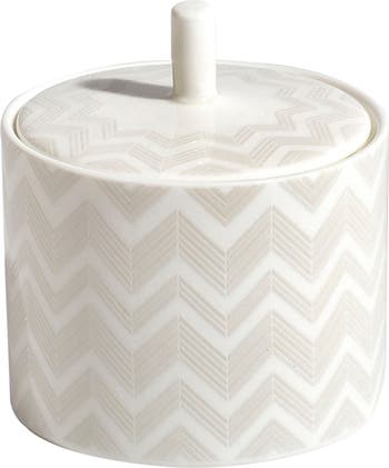 The Missoni Zig Zag collection is a homage to the iconic zigzag stitches that made Missoni's designs instantly recognizable and elevated the brand to global luxury status in the 1960s. Multicolored or self-patterned white, the Zig Zag line is a best-selling line. The range includes dinnerware, flatware, glassware, trays, and scented candles.