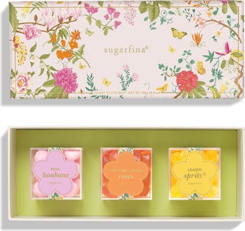 Celebrate the blossoming flowers and sunlight of the changing season with this botanical-patterned gift set filled with elegant transparent cubes stuffed with three of the brand's favorite artisan confections.