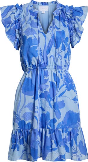 Playful ruffles trim the neck, cap sleeves and hem of a beautiful minidress designed with an elasticized waist and long ties at the split neck.