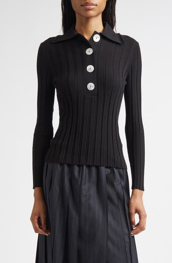The sister design duo transforms the classic polo into a standout of texture and contrast. This slim-fitting style is knit in a wide-gauge ribbed stitch from supersoft merino wool, then embellished with statement-scale mother-of-pearl buttons.