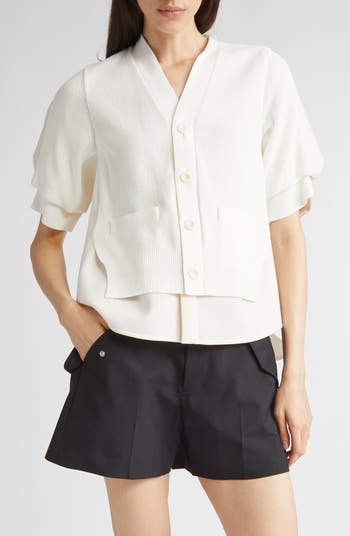 A master of contrarian textures, Chitose Abe employs her technical wizardry to create this hybridized cardigan that combines soft knitwear and wool-enriched suiting fabric into one bold statement.