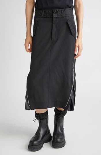 A master of contrarian textures, Chitose Abe employs her technical wizardry to create this hybridized midi skirt that combines sporty nylon and wool-enriched suiting fabric into one bold statement. Zipped side slits reveal pleated panels, adding more volume to the skirt.