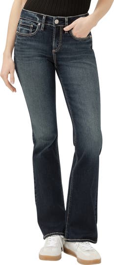 Designed to enhance an hourglass shape, these stretchy bootcut jeans feature full-length legs and a contoured waistband that easily prevents gapping.