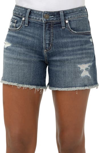 Designed to complement a curvy figure, these stretch-denim shorts feature frayed hems and a contoured mid-rise waist that creates a gap-proof fit.
