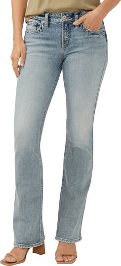 Designed to complement a curvy figure, these stretchy bootcut jeans feature button-flap back pockets and a contoured mid-rise waist that offers a gap-proof fit.