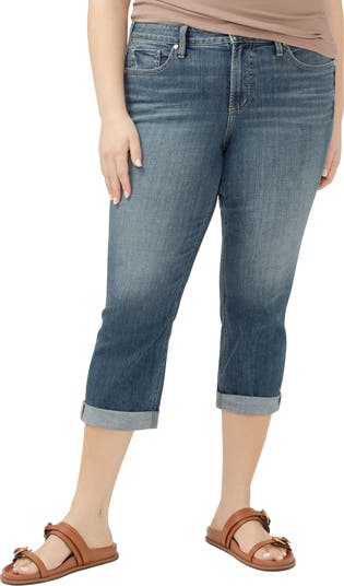 Designed to enhance a curvy figure, these mid-rise capris are made from faded stretch denim with a contoured waistband that easily prevents gapping.