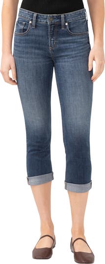 Designed to complement a curvy figure, these stretch-denim capris feature an everyday dark wash and a contoured mid-rise waist that easily prevents gapping.
