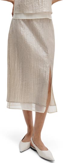 A gauzy lining intensifies the modern sophistication of this shimmering metallic midi skirt.