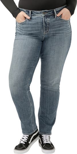 In a flattering cut to accommodate curvier hips, distressed straight-leg jeans feature a rich indigo wash with thick stitching for even more depth.