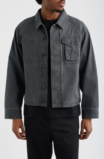 A faded, washed finish lends lived-in appeal to a signature buttoned jacket fashioned from pure cotton.