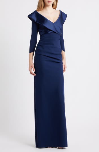 A folded neckline and ruched detail bring texture and dimension to this shapely evening gown designed to make a striking impression at any event.