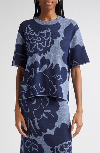 A charming peony pattern that captures summer’s floral splendor at its finest captivates in subdued hues on this boxy and oversized shirt cut from a breathable linen and cotton blend.