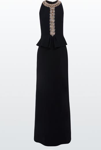 Designed with a High Neckline and sleeveless cut, this gown features intricate embellishment through the collar and bodice. A soft peplum detail adds structure and definition at the waist, leading into a fluid, floor-length skirt. The clean lines and subtle shaping give it a polished, modern feel. Ideal for formal receptions, weddings or black-tie events.
