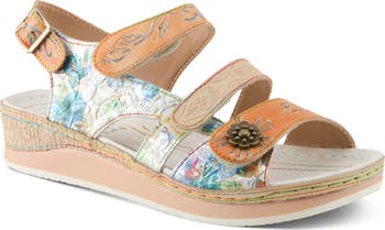 Artfully weathered hardware adds an extra touch of vintage charm to this wedge sandal featuring hand-painted flowers along with memory foam cushioning for everyday comfort.