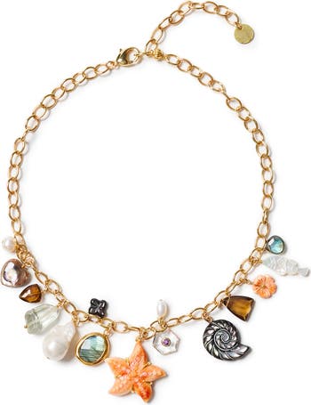Shimmer like the sun-dappled ocean when you wear this spectacular necklace adorned with a mixed of sea-inspired charms.