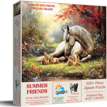 Summer Friends 500 pc Jigsaw Puzzle by SunsOut - 500 Large Pieces Jigsaw Puzzle - Completed Size: 19.25" x 26.625" - Puzzle Artist: John Stewart - Interlocking Pieces and Durable Construction: SunsOut jigsaw puzzles feature interlocking pieces that fit securely, making assembly easier and reducing frustration. -Ages: 15 years and older - Perfect for adults and seniors. SunsOut puzzles ensure high manufacturing standards ensuring their commitment to quality and customer service. - SunsOut puzzles use soy based inks, high quality puzzle board. As this is a jigsaw puzzle: assembly is required and batteries are not required.