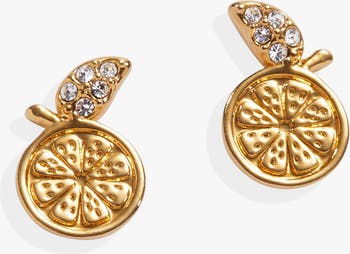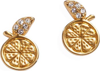Add a zesty twist to your jewelry game with the Summer Fruits Orange Slice Stud Earrings. These dimensional studs feature a juicy orange slice design with sparkling crystal details, crafted in shiny gold-tone brass. Fresh, fun, and full of flavor, they're the sweetest way to brighten up your day.