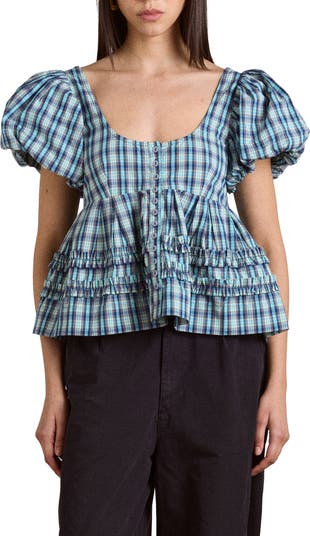 Cheery checks and frilly bits animate a summery top made from cool organic cotton.