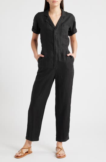 Light and easy, this summery jumpsuit is updated in crisp linen and framed by abbreviated sleeves.
