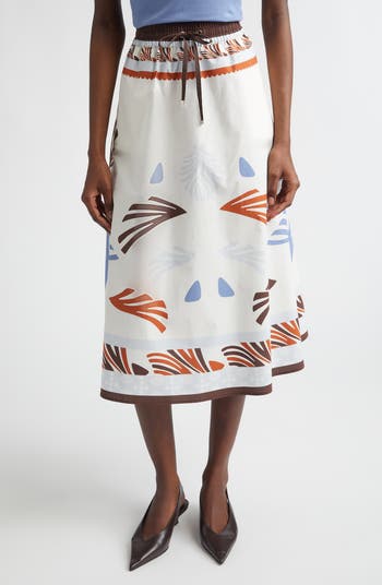 A placed print of abstract motifs that recall the branching beauty of coral reefs enhances the destination-ready vibes of this A-line midi skirt cut from lightweight cotton.