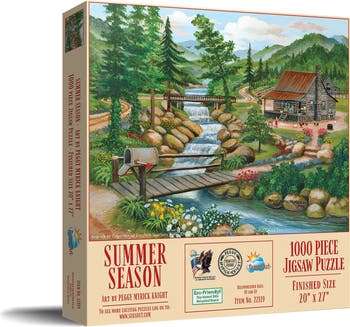 Experience the tranquil beauty of nature with the Summer Season 1000 piece jigsaw puzzle. This exquisite artistry by Peggy Myrick Knight captures the idyllic charm of a summer farmhouse, with flowing rivers and vibrant greenery that offer a serene escape from everyday stress. SunsOut Puzzles ensure a smooth puzzle assembly experience thanks to their renowned precision-cut, interlocking design. Each piece, carefully crafted from high-quality recycled cardboard, fits seamlessly, eliminating frustrating gaps. Dedicated to eco-friendly practices, SunsOut prints puzzles with soy-based inks on recycled board, manifesting their commitment to sustainability. This woman-owned small business proudly operates from the USA, maintaining high manufacturing standards. Should you experience issues with missing or damaged pieces, SunsOut's outstanding customer service team is ready to ensure complete satisfaction with their worry-free guarantee. Furthermore, the fully licensed artwork that brings life to this puzzle completes at dimensions of 20" x 27", creating a striking piece of art you'd be proud to display. Let the detailed imagery and vibrant colors of Peggy Myrick Knight’s work captivate you as you incorporate this masterpiece of art and craftsmanship into your puzzle collection. Perfect for adults seeking a relaxing yet engaging activity, the Summer Season jigsaw puzzle also makes a thoughtful gift for nature lovers and allows you to celebrate the joy of summer all year round!