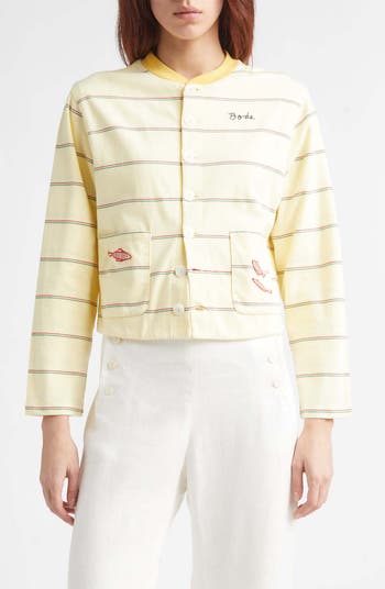 From Bode's tribute to American composer Morris 'Moose' Charlap, this striped cotton cardigan is decorated with Long Lake fish appliqués inspired by summers spent at Camp Onibar, where Charlap was a music counselor as a teenager.