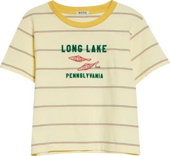 From Bode's tribute to American composer Morris 'Moose' Charlap, this striped cotton T-shirt is decorated with Long Lake fish appliqués inspired by summers spent at Camp Onibar, where Charlap was a music counselor as a teenager.