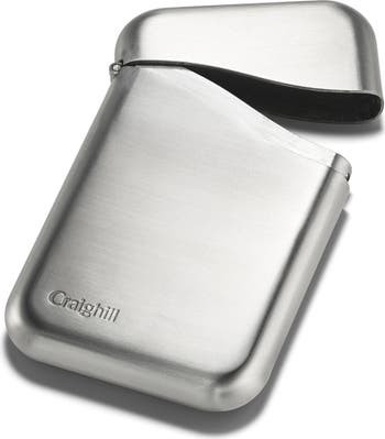 A hinged lid secures this sleek, brushed-finish case that makes a stately home for your most important cards.