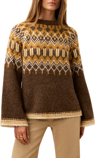 A folkloric Fair Isle design fans out from the yoke of a wide-sleeve sweater trimmed with stripes and knit from alpaca- and merino-wool-rich yarns.