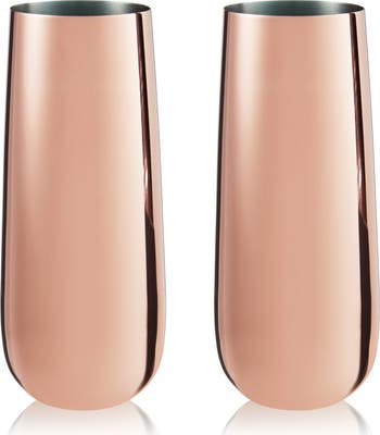 Polished and perfectly rounded to fit in the curve of your palm, these stemless champagne flutes look stunning on any tabletop. Gleaming copper plating catches the light, evoking luxury and warmth.