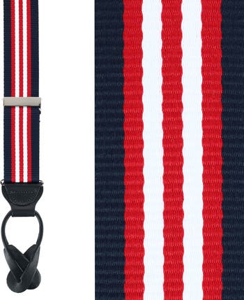 These Sumner Grosgrain Weave Striped Button End Braces will add a pop of color to your outfit. These button-end braces have front and back formal ends that simply attach to your waistband with buttons. This pair of button-end braces also includes 6 buttons to be sewn into your pants if needed. Handcrafted in the USA, these button-end braces are adjustable up to 54 inches and feature a Y-back style with an elastic back strap providing the most comfort. Great for a casual day in the office or elevating your outfit for that special event, these formal braces can be paired with khakis, suit pants, or jeans. The dapper back patch and end patches are made of full-grain leather and come with silver adjusters to customize to your liking.
