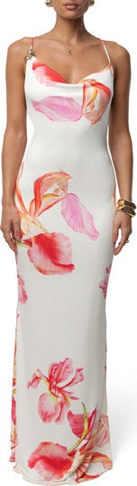 A goldtone flower brooch sits at one strap of this slinky, floor-grazing slipdress detailed with a draped cowl neckline and a dreamy floral print.