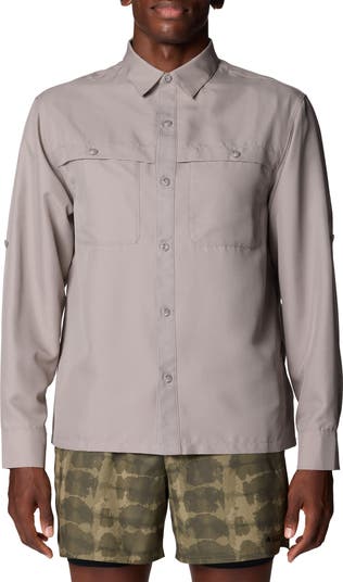 A dobby-woven long-sleeve shirt is made for outdoor adventures on sunny days with specialized HeiQ cooling and anti-odor technology, UPF 50 ray protection and an integrated mesh vent on the back panel.