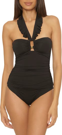 A sunny cutout secured with golden buckle hardware also secures the vacay vibes of this tankini swim top featuring convertible straps that can be worn as a halter or tied around the topline.
