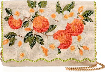 Bright, sparkly, and totally citrus chic! This fully beaded bag features ornate orange blossoms and dimensional beaded oranges for an elevated, opulent look. A beautiful scalloped edge adds vintage character, while the orange leather gusset gives the silhouette depth. Designed to be worn crossbody or carried as a clutch, it brings bold color and artisanal craftsmanship to any outfit.