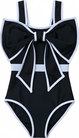 - One-piece black swimsuit with white trim and statement bow accent