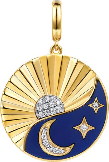 Bold blue enamel separates night from day on this 14-karat gold medallion charm sparkling with pavé diamonds.