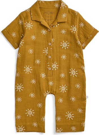 Our Sunshine Muslin Jumpsuit is a soft, breathable outfit perfect for everyday wear. Crafted from organic cotton muslin in a mustard yellow shade, it features a playful sun print and a relaxed fit for comfort.