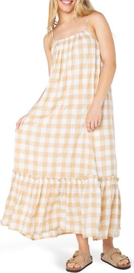A sumemry sleeveless maxi is cut from a lightweight cotton blend and covered in cheerful checks. Its flouncy ruffled hem adds graceful movement to this sweet look.