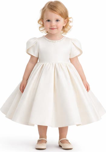 A timeless formal piece crafted for little ones, this elegant dress features a smooth satin finish, delicate puff sleeves, and subtle embellishments at the neckline. Perfect for weddings, christenings, or any special celebration.