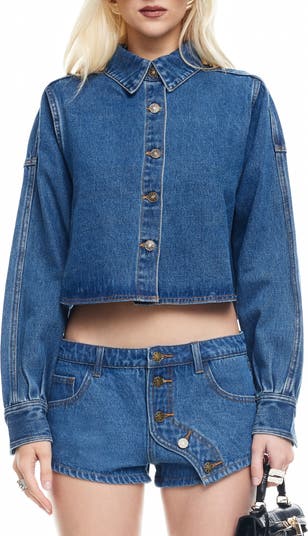 A boxy, cropped silhouette brings a modern-cool look to this medium-wash denim shirt topped with a polished point collar.