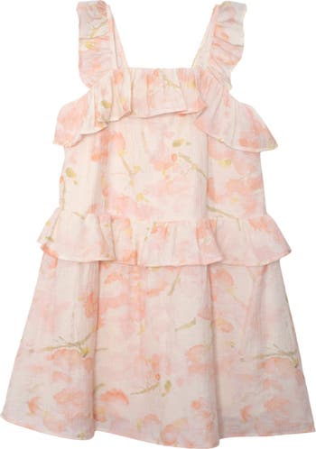 Brighten up sunny days with our soft-hand woven dress. The design features playful ruffled straps and a tiered skirt that adds lovely movement to every step. The soft peach and blush watercolor print creates a sweet look. Fabric Care & Content Machine Wash Cold | Line Dry | Do Not Bleach 80% Viscose 20% Nylon Denier lining