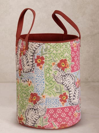 The Sundunce Laundry Storage Basket brings a touch of modern chic to everyday routines, showcasing 100% cotton craftsmanship sustainably sourced from India. Each basket is a labor of love, meticulously handcrafted with intricate patchwork detailing that features playful tigers and vibrant florals—a tribute to the creativity and artistry of skilled artisans. Designed to complement both modern and eclectic interiors, this basket redefines functional décor with a lively expression of contemporary design. Embrace this one-of-a-kind piece and elevate your living space with a blend of practicality and visual artistry, celebrating the spirit of traditional craftsmanship.